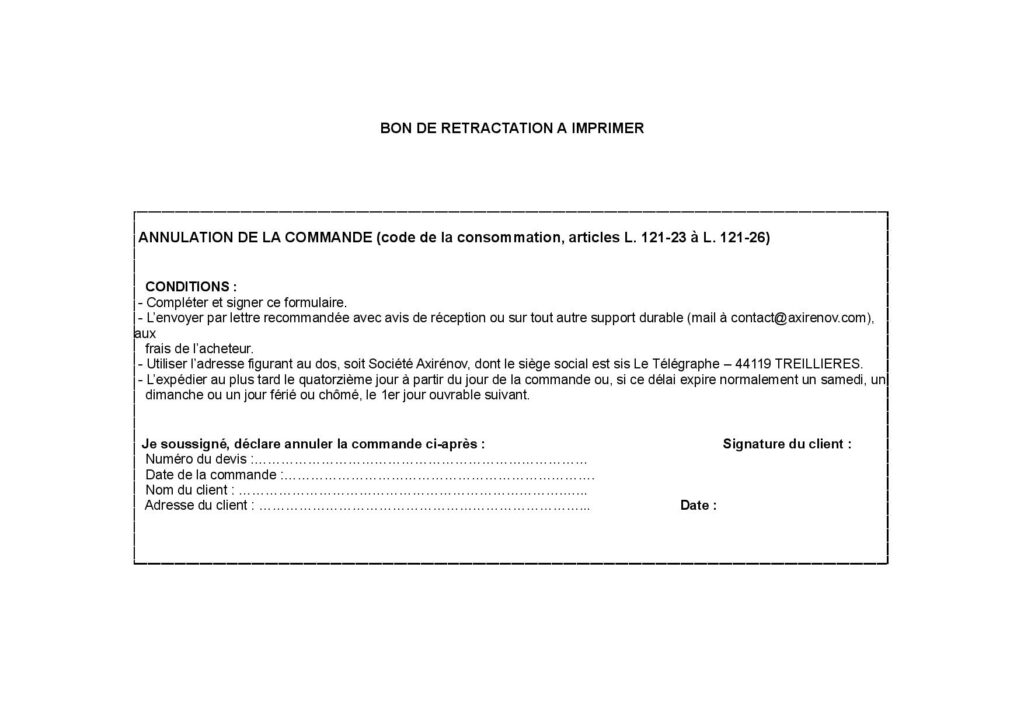 exercer le droit de rétractation, vous devez nous notifier (a l’attention de la Société AXIRENOV 1510 route du Télégraphe 44119 TREILLIERES) votre décision de rétractation du présent contrat au moyen